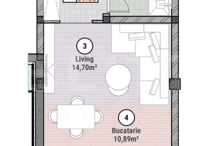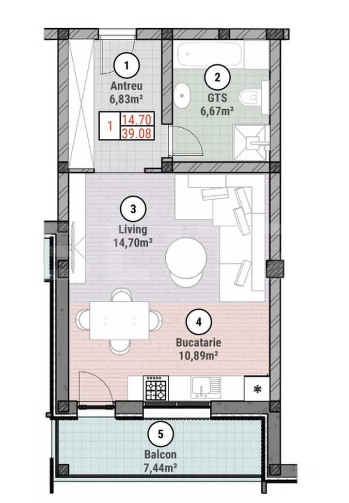 Proprietatea este compusă din : living+ bucătărie , baie, balcon de 7,44 mp. suprafată utilă 39 mp.