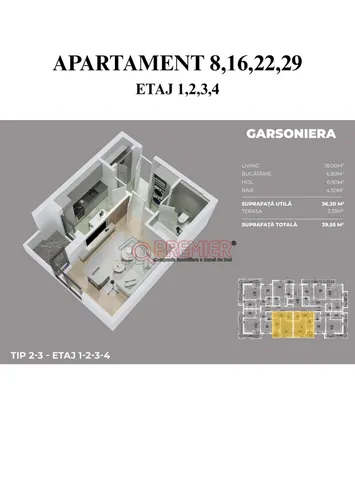 Mobilat: nemobilat, Stare interior: nou, Compartimentare: decomandat, Bucatarie: nemobilata, Usi interior: celulare, Vechime imobil: nou, Stadiu constructie: finalizat, Stare imobil: exceptionala, Tipuri de apartamente: garsoniere, 2 camere, 3 camere, Pereti exteriori: beton, Caramida, Izolatie exterioara: tencuiala, Polistiren extrudat, Pereti interiori: beton, Caramida, Izolatie interioara: polistiren extrudat, Fatada: vopsea decorativa, Confort: i, Structura: caramida, Plansee: beton armat, Fundatie: cu ziduri (beton turnat), Cu ziduri (caramida), Acces: acces stradal, Strazi limitrofe: amenajate, Proprietate publica, Asfaltate