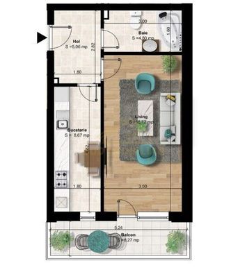 suprafata utila de 36.65 mp,balcon de 8.27 mp