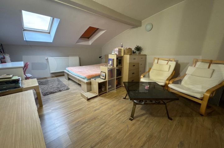 Apartamentul dispune de ferestre de mansardă Velux, care oferă lumină naturală din plin, încălzire cu centrală proprie pentru costuri reduse și se vinde complet mobilat și utilat, exact ca în fotografii. Compartimentarea este eficientă, ceea ce îl face potrivit atât ca locuință personală, cât și ca investiție, zona fiind una cu cerere ridicată pentru închiriere.