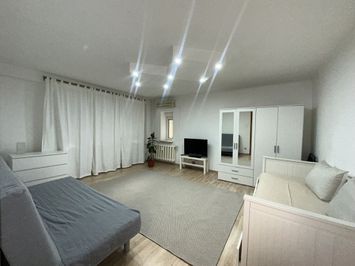 Garsoniera Strada Matei Basarab in intersectia cu strada Traian, vedere stradala, renovata, libera, bucatarie complet mobilata si utilata inclusiv cu masina spalat vase, rufe, cafetiera, etc. La baie este montat boiler pentru apa calda, deci... adio zile fara apa calda.
