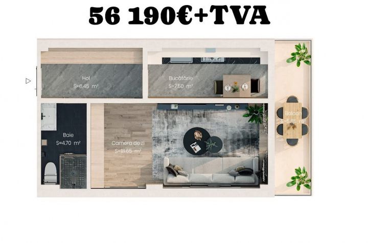 * 1 cameră 43 mp total = 51.190 + TVA