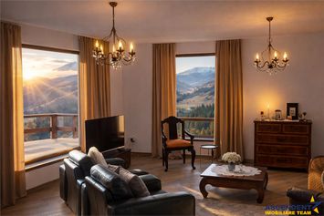 Interiorul este mobilat, cu finisaje atent alese: parchet si gresie, pereti finisati cu faianta si lavabil, ferestre termopan PVC, izolatie termica exterioara, incalzire prin centrala termica si calorifere. Spatiile sunt luminoase, aerisite si gandite pentru a oferi atat functionalitate, cat si atmosfera calda de refugiu montan. Zona de living cu semineu, dormitoarele cu privelisti spectaculoase si bucataria primitoare creeaza un echilibru intre eleganta, confort si autentic.