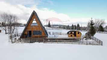 Aceasta cabana moderna tip A-frame, construita din lemn, are o suprafata de 100 mp si este amplasata pe un teren de 200 mp, complet imprejmuit si amenajat.
