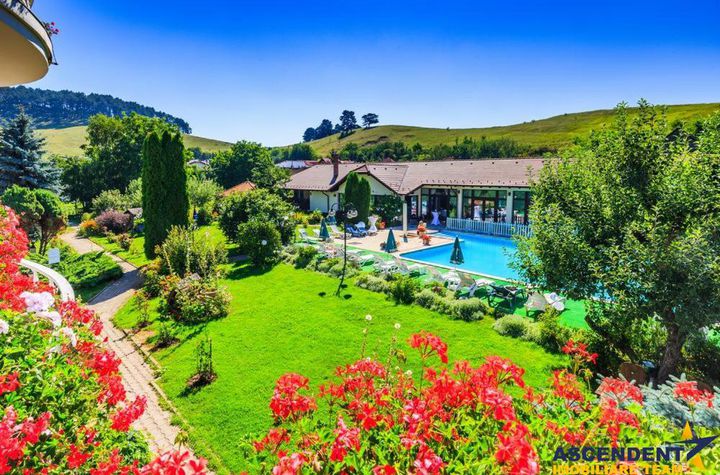 Complexul este asortat cu o gradina superba, amenajata in jurul unei piscine exterioare de 150 mp (10x5), acesta fiind locul preferat si pentru organizarea celebrarilor in aer liber.