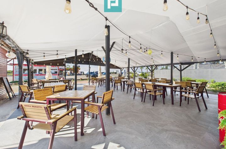 Spatiul dispune de o terasa generoasa, cu 25 de mese si o capacitate de peste 80 de clienti, unde sunt amenajate doua grupuri sanitare pentru clienti si o zona de gratar.