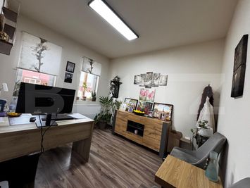 Compartimentare parter: 3 birouri, garaj/atelier, 2 băi, vestiar, spațiu tehnic cu centrală pe lemne.