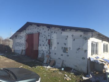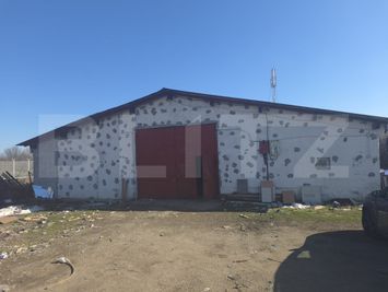 Construcția este solidă, realizată din beton, cu acoperiș din tablă, fiind potrivită pentru diverse tipuri de activități industriale sau logistice. Curtea generoasă oferă spațiu suficient pentru manevrarea camioanelor, depozitare sau extindere.