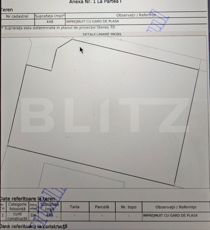 Blitz vǎ propune la vânzare teren intravilan situat într-o zonă rezidențială liniștită, cu acces facil la drum asfaltat. Ideal pentru construcția unei locuințe individuale. Suprafața permite amenajarea unei case cu grădină și curte generoasă. Suprafață: 488 mp Utilități: apă, curent, gaz, canalizare – disponibile la teren. Pretabil pentru locuință proprie sau investiție.