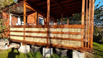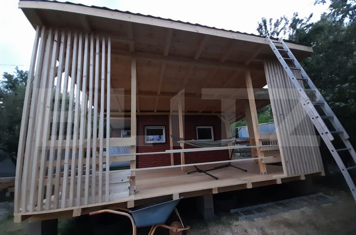 Proprietatea este un teren împrejmuit, cu o cabană modernă pe piloni, ridicată astfel încât să ofere priveliști largi și aer curat, completată de o terasă generoasă, ideală pentru dimineți liniștite, cine la apus sau întâlniri cu prietenii.