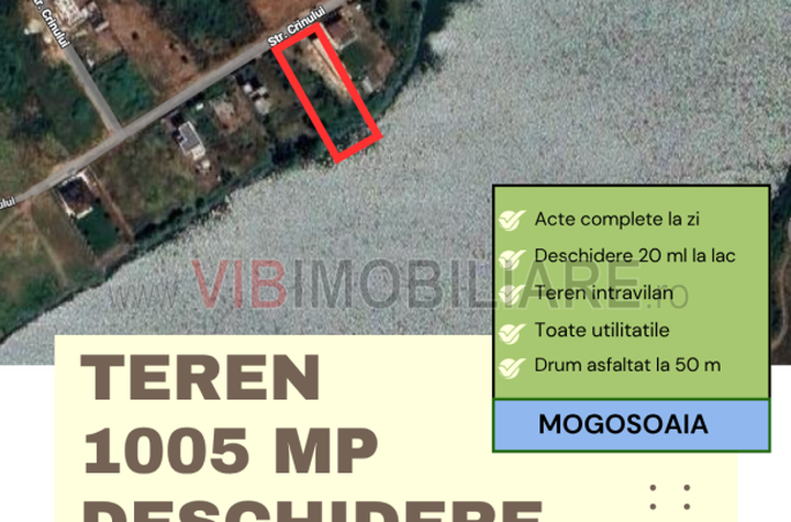 Vă propunem spre vânzare un teren intravilan cu poziționare deosebită, situat în Mogoșoaia, având deschidere directă de aproximativ 20 ml la lac, unul dintre puținele loturi disponibile cu acest avantaj.
