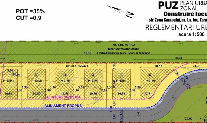 Terenul face parte din categoria constructii și are indicii urbanistici POT de 35 % și CUT de 9.00 %, ceea ce permite dezvoltarea unor construcții conforme cu reglementările locale, în funcție de proiectul viitorului proprietar. Suprafața terenului oferă flexibilitate pentru amplasarea unei case individuale, a unui duplex, a unui mic ansamblu de locuințe sau a altor funcțiuni compatibile cu zona și cu planul urbanistic.