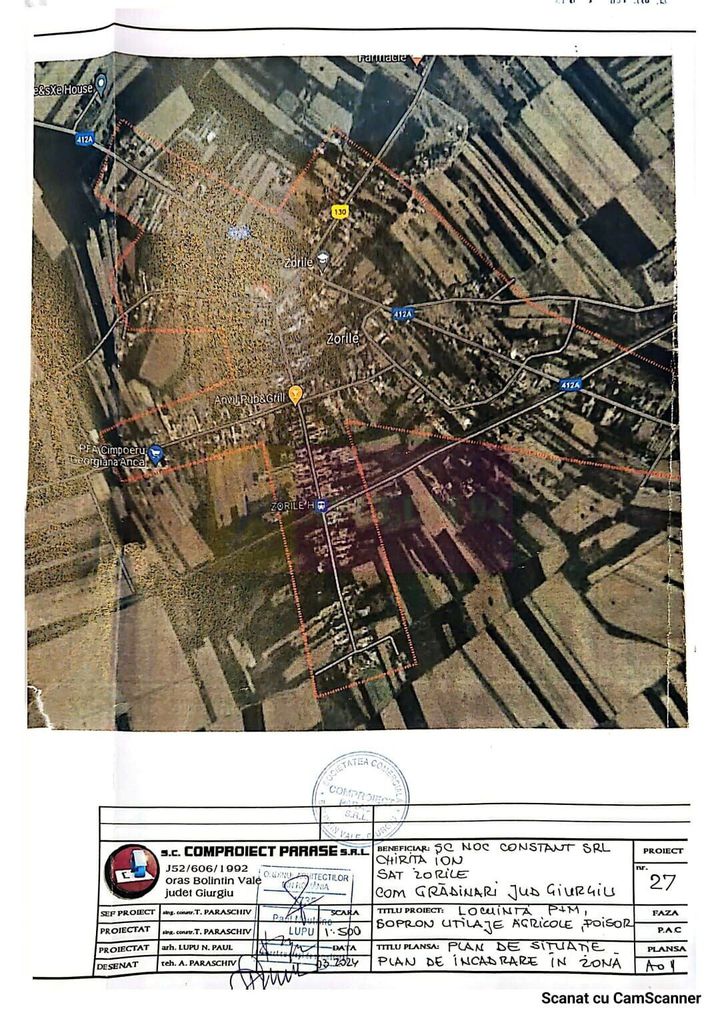 Pe teren este facuta constructie cu dimensiuni de 5,85mx5,75m .un foisor 6,30mx3,40m si hala deschisa pentru utilaje 24,10mx6,90m .