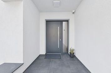 - Tamplarie aluminiu Cortizo 80 mm cu sticla laminata si securizata, usa de acces cu panou lipit