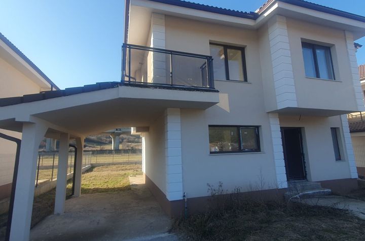 Stare mobilier: nou, Stare interior: nou, Bucatarie: deschisa inclusa in living, Compartimentare: decomandat, Vizionari: imobil liber, Curte: individuala, Gradina, Vechime imobil: nou, Stadiu constructie: finalizat, Stare imobil: exceptionala, Izolatie exterioara: tencuiala, Polistiren expandat, Fatada: vopsea decorativa, Piatra naturala, Tencuiala decorativa, Acoperis: tigla metalica, Structura: caramida, Plansee: beton armat, Tip vila: individuala, Fundatie: cu ziduri (beton turnat), Acces: acces stradal, Strazi limitrofe: proprietate publica, 2 benzi, Asfaltate, Drum judetean, Vedere: vedere mixta, Vedere pe spate, Vedere stradala