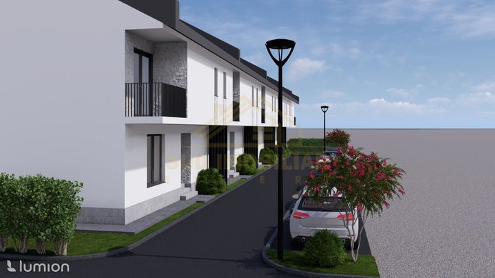 Stare interior: nou, Compartimentare: semi-decomandat, Curte: individuala, Vechime imobil: nou, Stadiu constructie: in constructie, Stare imobil: exceptionala, Structura: beton, Cadre, Pereti exteriori: caramida, Pereti interiori: caramida, Acoperis: tigla metalica, Izolatie exterioara: polistiren expandat, Tip vila: insiruite, Fundatie: cu ziduri (beton turnat), Acces: acces stradal, Strazi limitrofe: amenajate, 2 benzi, Asfaltate, Orientari: sud - vest, Vedere: vedere mixta