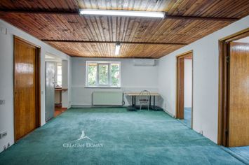 La parter se afla o camera cu suprafata de peste 49 mp care a fost amenajata si a functionat ca sala de repetitii (cu sisteme de antifonare) pentru o cunoscuta trupa de muzica, apoi a fost o scoala privata, dar, datorita marimii sale, poate fi folosita si ca spatiu de birouri, sala de cursuri (training) sau - pur si simplu - ca living. Aici se afla si o toaleta. Etajul este ocupat de alte doua camere, bucatarie, baie si un hol.