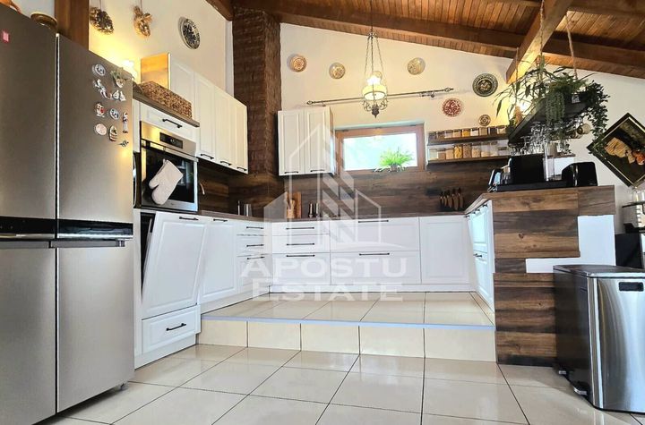 Mobilat: mobilat, Stare interior: finisat modern, Bucatarie: deschisa separata, Mobilata, Echipata, Frigider, Aragaz, Hota, Masina de spalat vase, Usi interior: pvc, Proprietarul plateste: telefon, Cablu tv, Curte: individuala, Gradina, Piscina: individuala, Exterioara, Stadiu constructie: finalizat, Izolatie interioara: polistiren extrudat, Acoperis: tigla ceramica, Tip vila: individuala, Strazi limitrofe: asfaltate