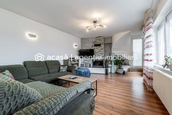 Finisaje: parchet laminat, Gresie, Vopsea lavabila, Faianta, Geamuri termoizolante - pvc, Calorifere fonta; jaluzele orizontale, Dotari: aer conditionat, Scara interioara, Sistem de alarma, Interfon, Masina de spalat rufe, Iluminat exterior, Spatiu agrement; cabină de duș, Cadă, Șemineu, Acoperiș