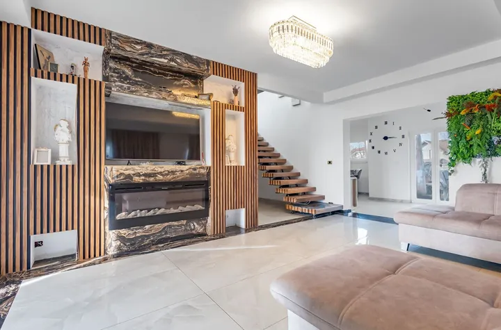 Pentru iubitorii de lux si liniste va propunem spre vanzare cu comision 0% o casa deosebita, cu o suprafata de 160 mp utili si 702 mp teren, in localitatea Dudestii Noi, la doar 30 de minute de centrul orasului Timisoara.
