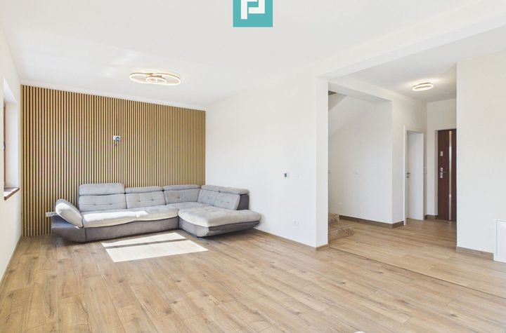 Finisaje: parchet laminat, Gresie, Vopsea lavabila, Faianta; ferestre care se deschid, Dotari: scara interioara, Sistem de alarma, Iluminat exterior, Videointerfon; irigații, Cabină de duș, Cadă, Acoperiș, Telecomandă poartă acces auto