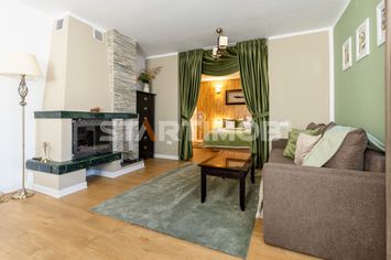 Finisaje: parchet laminat, Gresie, Vopsea lavabila, Faianta, Geamuri termoizolante - pvc, Calorifere fonta, Tapet; ferestre care se deschid, Dotari: sistem de alarma, Interfon, Usa metalica, Masina de spalat rufe, Iluminat exterior, Televizor, Wireless; cabină de duș, Șemineu
