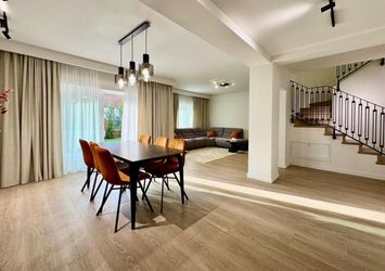 Mobilat: mobilat, Stil mobilier: modern, Stare mobilier: nou, Stare interior: nou, Bucatarie: mobilata, Echipata, Combina frigorifica, Frigider, Aragaz, Plita electrica, Cuptor electric, Hota, Masina de spalat vase, Compartimentare: decomandat, Usi interior: lemn masiv, Camere speciale: mansarda, Curte: individuala, Gradina, Piscina: comuna, Exterioara, Vechime imobil: nou, Stadiu constructie: finalizat, Stare imobil: exceptionala, Structura: beton, Pereti exteriori: beton, Caramida, Pereti interiori: caramida, Acoperis: tigla ceramica, Plansee: beton armat, Tip vila: duplex, Acces: acces stradal, Strazi limitrofe: amenajate, Vedere: vedere mixta