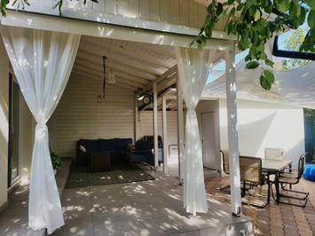 Zona din spatele casei are de asemenea si zona de servit masa pe timpul verii. Gradina este amenajata cu spatiu de joaca pentru copii si pomi fructiferi ( meri, peri, visini, ciresi). Amplasamentul casei este unul extrem de linistit si facil catre toate obiectivele zonei - la mers pe jos de Lidl, Jolie ville, scolile si gradinitele din zona, restaurante, cluburi sportive, padurea Baneasa.