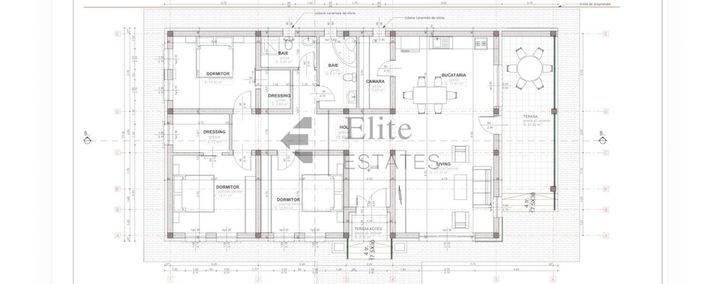 Hol intrare, zona de zi cu bucatarie, camara, 2 bai, 3 dormitoare cu dresing, terasa deschisa
