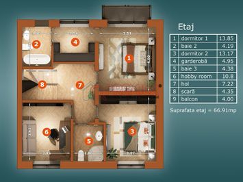 La mansarda se afla zona open space, destinata unui biroul, sau de ce nu, hobbyurilor, avand acces si la terasa. Desigur, se afla si o baie.