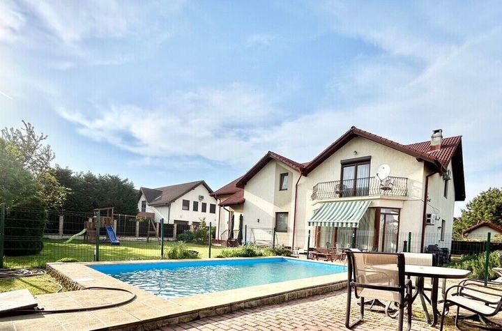 Mobilat: semi-mobilat, Nemobilat, Stil mobilier: modern, Stare interior: in stare foarte buna, Bucatarie: mobilata, Echipata, Combina frigorifica, Frigider, Aragaz, Plita gaz, Cuptor electric, Hota, Masina de spalat vase, Compartimentare: decomandat, Usi interior: lemn masiv, Curte: individuala, Gradina, Piscina: individuala, Exterioara, Stadiu constructie: finalizat, Stare imobil: exceptionala, Structura: beton, Pereti exteriori: beton, Caramida, Pereti interiori: caramida, Acoperis: tigla ceramica, Plansee: beton armat, Tip vila: individuala, Acces: acces stradal, Strazi limitrofe: amenajate, Vedere: vedere mixta