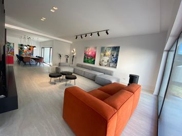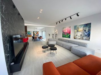 ground floor: generous living room of 44.5 sqm with exit to a terrace of 18.7 sqm, dining area of 15.6 sqm, open kitchen of 24.3 sqm, office/guest bedroom, bathroom with shower
