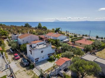 Dotări tehnice: rame din aluminiu cu plase anti‑insecte, geamuri duble, boiler solar pentru apă caldă, șemineu, pardoseli din plăci, balcon cu barbecue, grădină și spațiu pentru depozitare; orientare sud și clasă energetică H. Distanțe: 80 metri până la mare, aproximativ 3 km până la Ofrinio Beach, aproximativ 55 km până la oraș și 70 km până la aeroport.