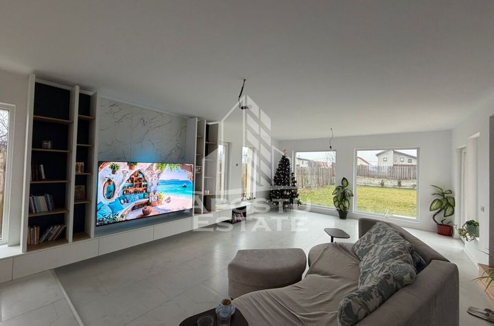 Finisaje: parchet laminat, Gresie, Vopsea lavabila, Faianta, Geamuri termoizolante - pvc, Dotari: telecomanda garaj, Masina de spalat rufe, Iluminat exterior, Wireless; irigații, Cabină de duș, Acoperiș