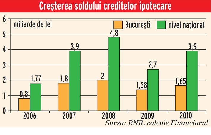 La nivel teritorial, cele mai multe credite ipotecare in euro sunt acordate bucurestenilor, cresterea soldului la finalul lunii octombrie 2010 fiind de 1,65 miliarde de lei, iar avansul fata de ince­pu­tul anului de 16,4%. De altfel, evolutia finantarii locuintelor de catre bancile din Capitala este oarecum similara celei de la nivel national. Astfel, in acest an se remarca si aici o revigorare a creditarii ipotecare, in conditiile in care cresterea soldului in primele 10 luni din 2009 a fost de numai 1,38 miliarde de lei. Cele mai multe imprumuturi ipotecare au fost acordate tot in 2008, avansul volu­mu­lui aferent perioadei ianuarie-octombrie plasandu-se la doua miliarde de lei. Desi in anul anterior, 2007, soldul a fost mai mic, de 1,8 miliarde de lei, ritmul de crestere pentru perioada analizata a atins un record de 65% peste cel inregistrat la nivel national, de 57,5%.